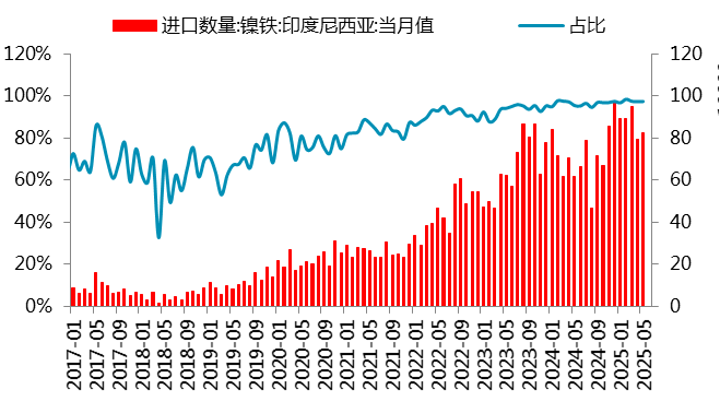 据中国海关数据统计,5月中国镍铁进口量84.8万吨,环比增加3.1万吨,增幅3.8%;同比增加19.7万吨,增幅30.2%。其中5月中国自印尼进口镍铁量82.6万吨,环比增加3.2万吨,增幅4.0%;同比增加20.4万吨,增幅32.9%。1-5月,中国镍铁进口总量451.6万吨,同比增加88.2万吨,增幅24.3%。其中,自印尼进口镍铁量440.4万吨,同比增加89.9万吨,增幅25.6%。