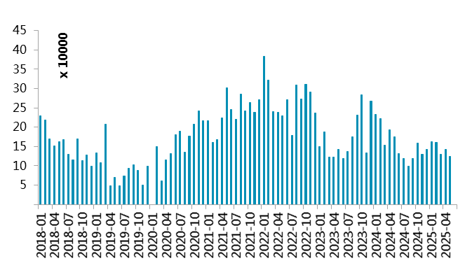 根据海关总署数据,5月国内不锈钢进口量约12.51万吨,环比减少1.7万吨,减幅12%;同比减少4.93万吨,减幅28.3%。2025年1-5月,国内不锈钢进口量累计约71.8万吨,同比减少25.85万吨,减幅26.5%。5月国内不锈钢出口量约43.63万吨,环比减少1.15万吨,减幅2.6%;同比减少2.13万吨,减幅4.7%。1-5月,国内不锈钢出口量累计约211.01万吨,同比增加19.81万吨,增幅10.4%。