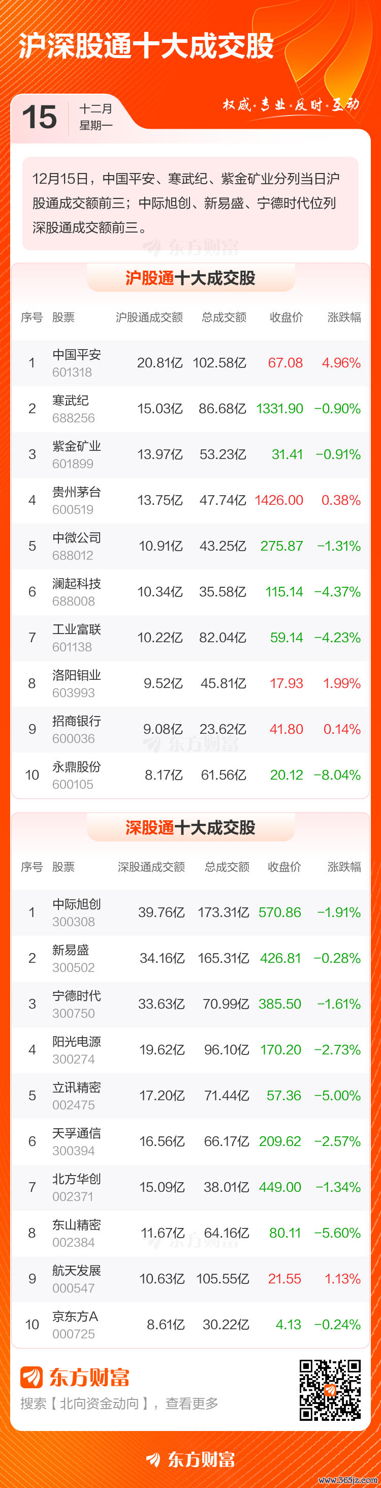 中国平安、寒武纪、紫金矿业位列沪股通成交前三,成交额分别为20.81亿、15.03亿、13.97亿;中际旭创、新易盛、宁德时代位列深股通成交前三,成交额分别为39.76亿、34.16亿、33.63亿。