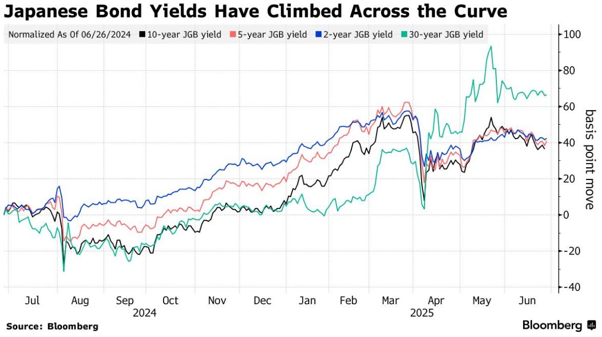 5月下旬日本国债因疲软拍卖而暴跌,30年期和40年期收益率创发行以来新高。全球对财政赤字扩大的担忧加剧债市动荡,主要债券市场与日本国债同步下挫。