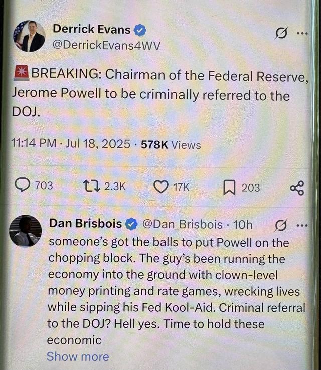 突发事件:美联储主席杰罗姆·鲍威尔将被刑事移交美国司法部。