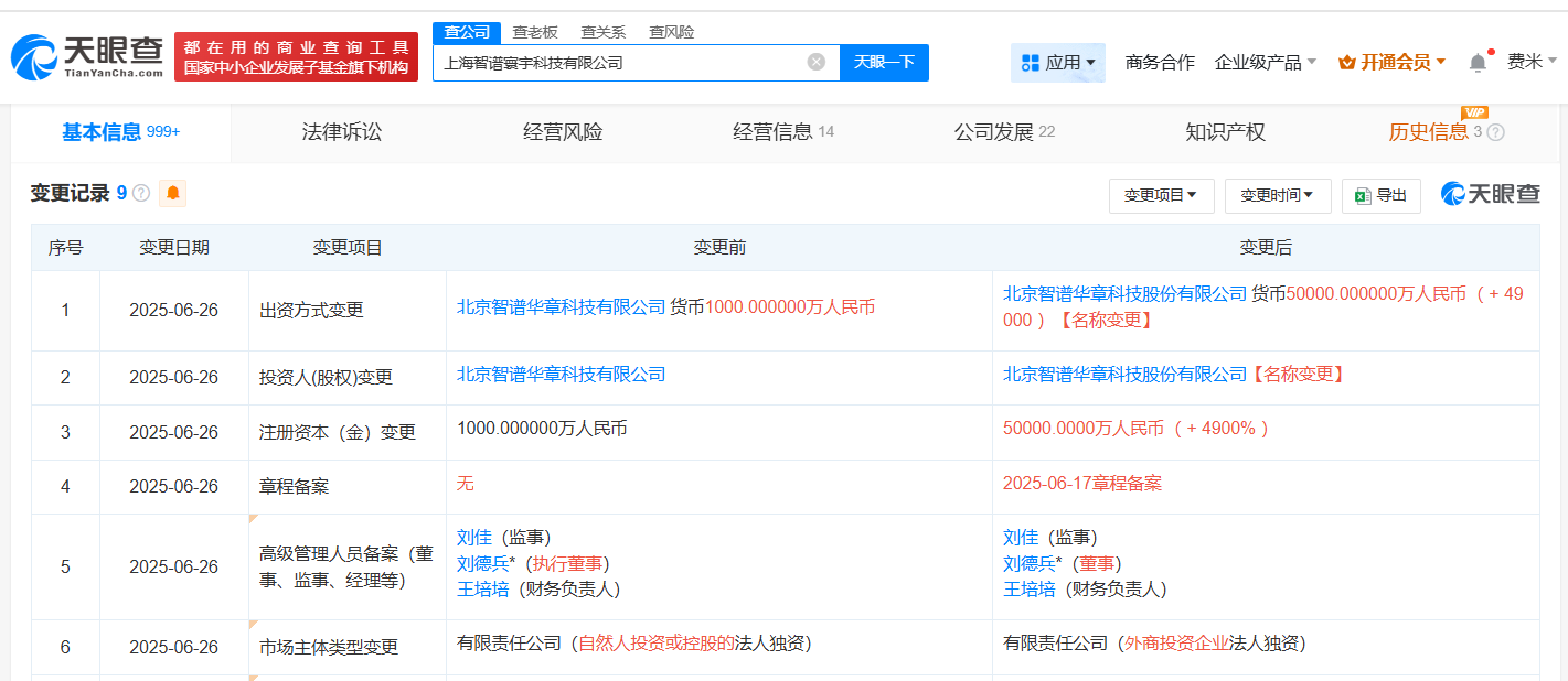近日,上海智谱寰宇科技有限公司发生工商变更,注册资本由1000万人民币增至5亿人民币,增幅4900%,同时刘德兵由执行董事改任董事。该公司成立于2024年5月,法定代表人为刘德兵今日云策,经营范围包括人工智能基础软件开发、人工智能应用软件开发、数据处理和存储支持服务等,由智谱AI关联公司北京智谱华章科技股份有限公司全资持股。