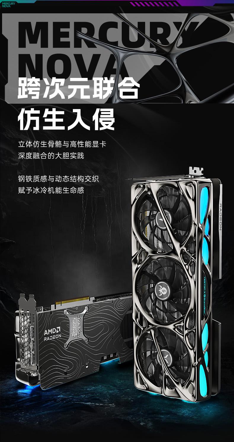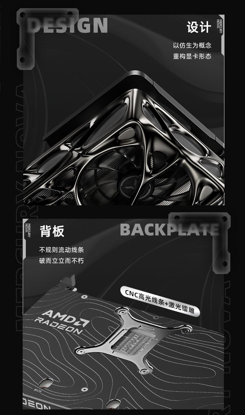 RX 9070 XT 破茧 Mercury Nova OC 采用独家散热器方案,基于 12L 叠层 PCB,配备均热板 + 七根 6mm 热管 + 鳍片组 + 三颗 93mm 双滚珠轴承风扇的散热模组,加速频率 3060MHz (+90MHz)。