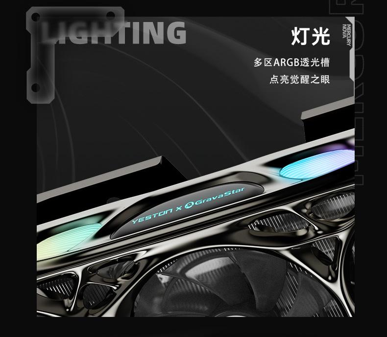 这张联名显卡采用重力星球标志性的异形仿生设计,拥有立体钢铁骨骼曲面镂空外框,配备以 CNC 不规则流动线条装饰的背板,四周则是具备双重灯效模式的内嵌式灯光系统。