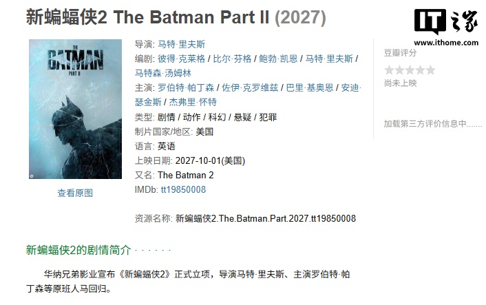 这部影片仍由 Robert Pattinson 主演,续集将延续前作风格,独立于 DC 主宇宙之外。该片原计划 2025 年上映,后因好莱坞罢工推迟至 2027 年 10 月,目前预计将于 2026 年初开始拍摄。