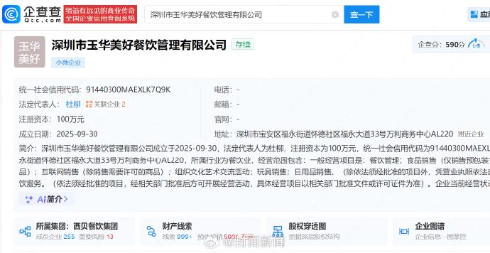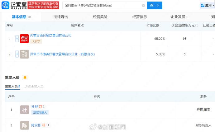 企查查APP显示,近日,深圳市玉华美好餐饮管理有限公司成立,法定代表人为杜柳,注册资本100万元,经营范围包含餐饮管理、食品销售(仅销售预包装食品)、食品互联网销售(仅销售预包装食品)、互联网销售(除销售需要许可的商品)等,该公司由内蒙古西贝餐饮集团有限公司、深圳市本康美好餐饮管理合伙企业(有限合伙)分别持股95%、5%。