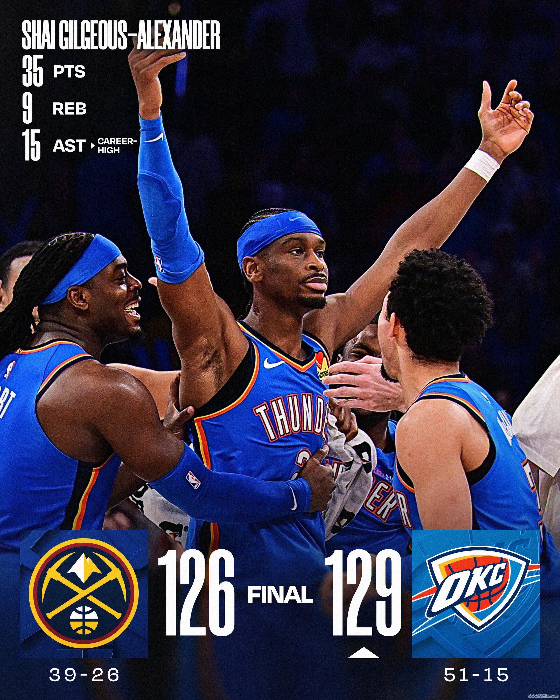 3月10日,NBA常规赛,雷霆129-126掘金。雷霆队亚历山大35分9篮板15助攻2.7秒三分准绝杀,连续126场20+追平张伯伦,杰林29分12篮板,阿杰-米切尔24分,麦凯恩13分,以赛亚-乔13分;掘金队约基奇32分14篮板13助攻,小哈达威28分,戈登23分10篮板,穆雷21分8篮板6助攻。