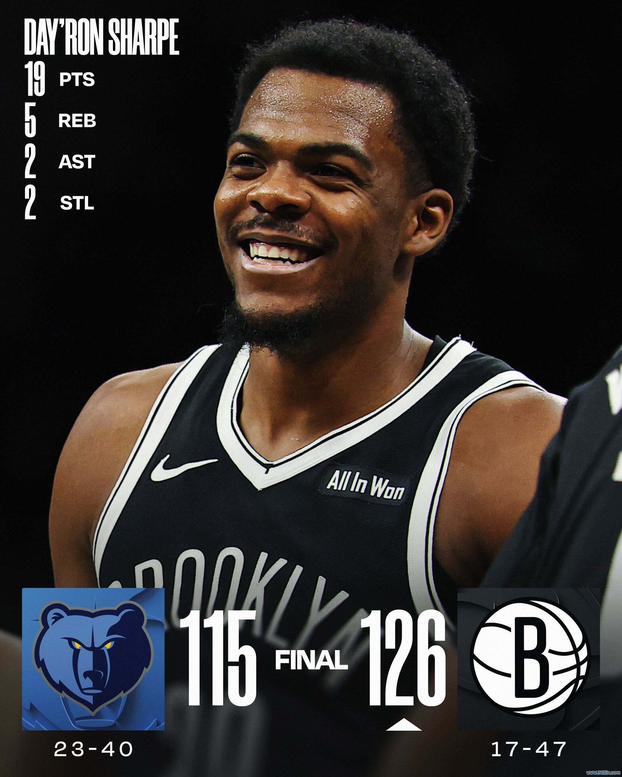 3月10日,NBA常规赛,篮网主场对阵灰熊。篮网末节轰14-4拉开分差,再轰10-1攻势终结悬念,篮网126-115力克灰熊,送给对手4连败。篮网6人得分上双,波特缺席,夏普19分5篮板,阿巴基18分3篮板,特拉奥雷17分4助攻,沃尔夫17分9篮板。灰熊多人缺席,吕佩尔20分8篮板,斯莫尔19分7篮板3助攻,杰克逊18分4篮板4助攻,威尔斯17分5篮板。